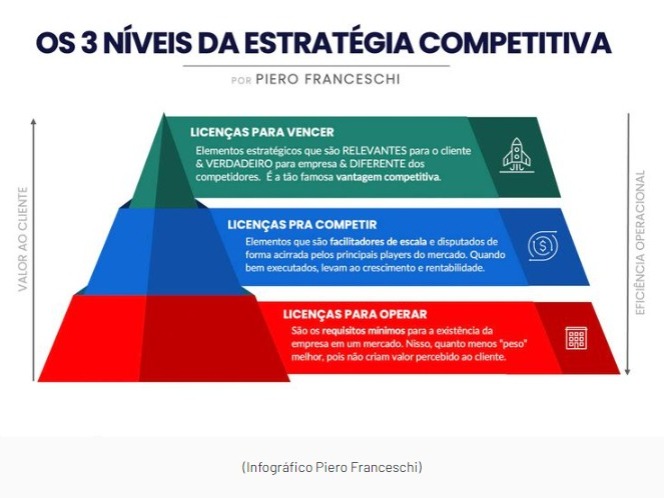 Desenvolvido por Piero Franceschi, sócio da StartSe, o modelo de Licenças Estratégicas propõe algo diferente: ao invés de focar em verdades absolutas, ele organiza os ativos de uma empresa em três níveis — Licenças para Vencer, Competir e Operar — cada uma com um papel estratégico para garantir agilidade e adaptabilidade. Vamos destrinchar: